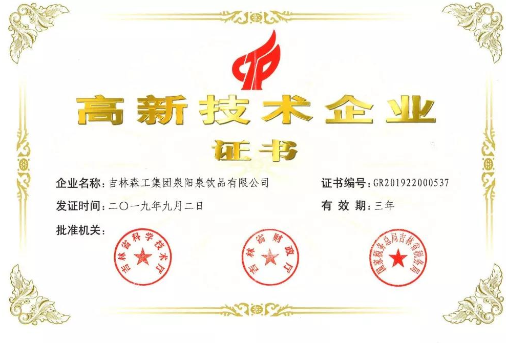 ? ? ? 根據(jù)科學(xué)技術(shù)廳、吉林省財政廳、國家稅務(wù)總局聯(lián)合頒布的《關(guān)于公布吉林省2019年第一批國家高新技術(shù)企業(yè)認(rèn)定結(jié)果的通知》,經(jīng)過層層審核,吉林森工集團泉陽泉飲品有限公司由吉林省科學(xué)技術(shù)廳、吉林省財政廳、北京市國家稅務(wù)局、國家稅務(wù)總局吉林省稅務(wù)局局聯(lián)合批準(zhǔn)下發(fā)的高新技術(shù)企業(yè)認(rèn)定。